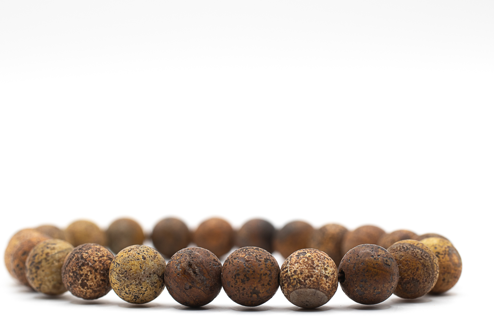Ton pământiu, cald — nuanțe de crem, ocru, maro și accente ruginite; model natural „rustic”, cu benzi subtile și incluziuni care dau fiecărei mărgele un aspect texturat, autentic și foarte natural. Finisajul poate fi satinat sau lucios, în funcție de lot, punând în valoare contrastele și venele pietrei.