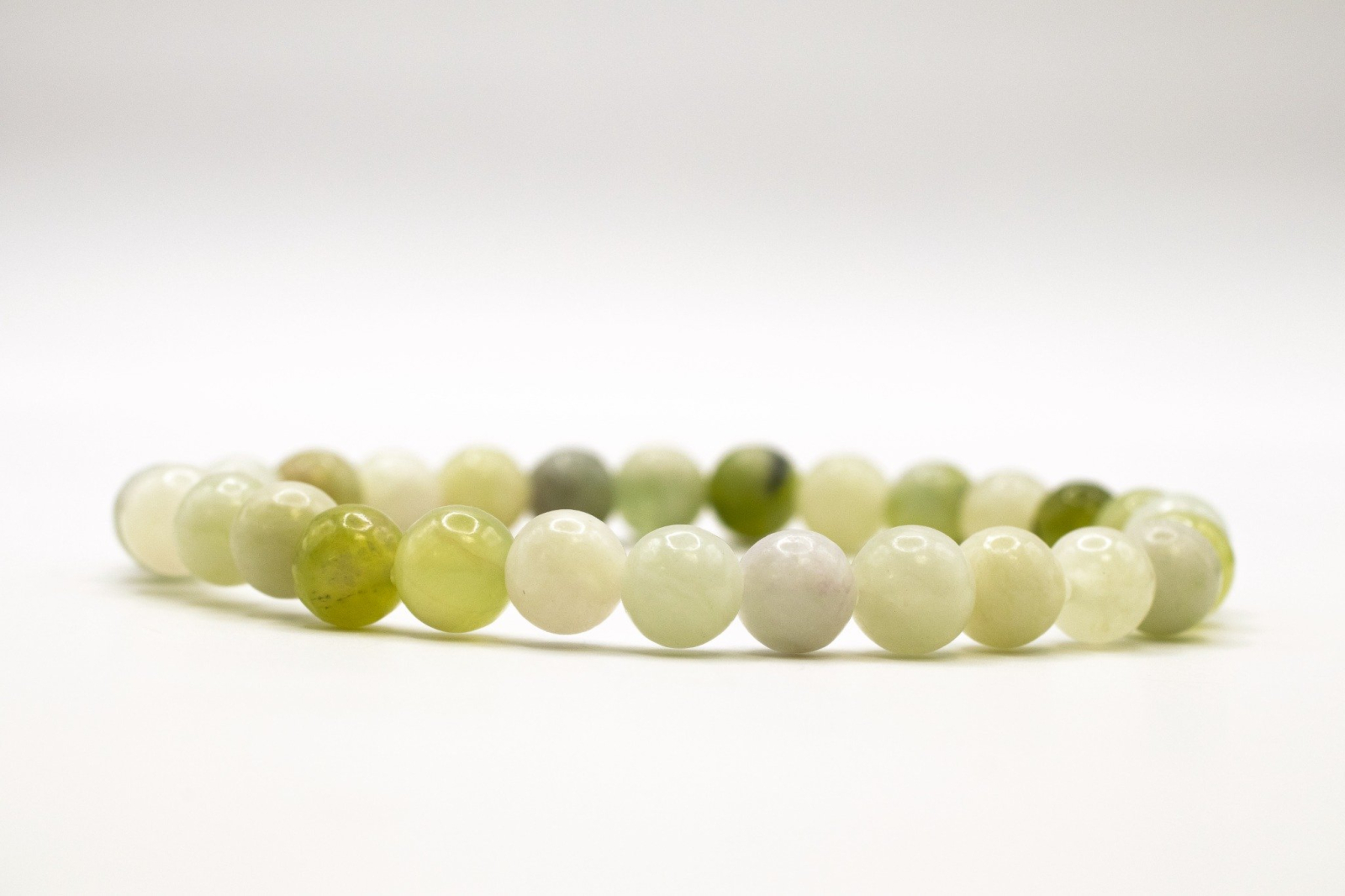 Ton verde-olive cald, uneori cu accente galbene sau maronii subtile; suprafața netedă și lucioasă oferă un aspect sofisticat, natural și ușor „terestru”. Fiecare mărgea poate prezenta variații de translucență și vene fine, conferind unicitate.